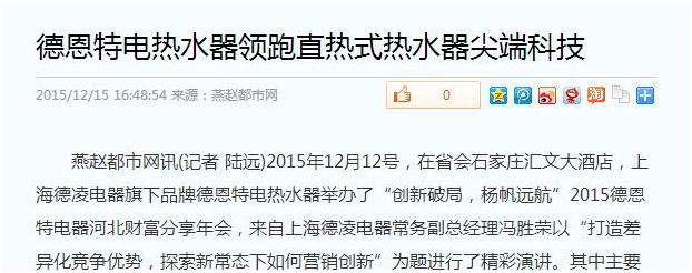 2015年12月12號,在省會石家莊匯文大酒店,上海德凌電器旗下品牌德恩特電熱水器舉辦了“創(chuàng)新破局,楊帆遠(yuǎn)航”2015德恩特電器河北財(cái)富分享年會